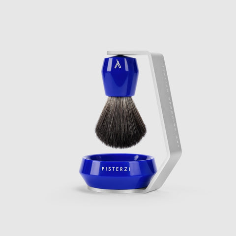 LINEA MAGNETE REPRESENTS A HARMONIOUS FUSION OF MATERIALS SOURCED RESPONSIBLY. ITS DISTINCTIVE DESIGN ENSURES STABILITY AND PRACTICALITY, WHILE THE SHAPES EVOKE THE FLUID MOVEMENT OF A DIVE INSPIRED BY THE OCEAN BLUE AMONG THE WHITE FOAM OF PISTERZI’S SHAVING CARE CREAM.